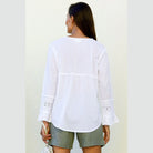 A fresh alternative to your classic button-through blouse, this pop over feminine style is made from soft organic cotton. Featuring a V-neckline, full-length sleeves and fluted gathered cuffs. Finished with lace detailing, circular embroidered motifs and cut to a curved slightly longer hem at the back.