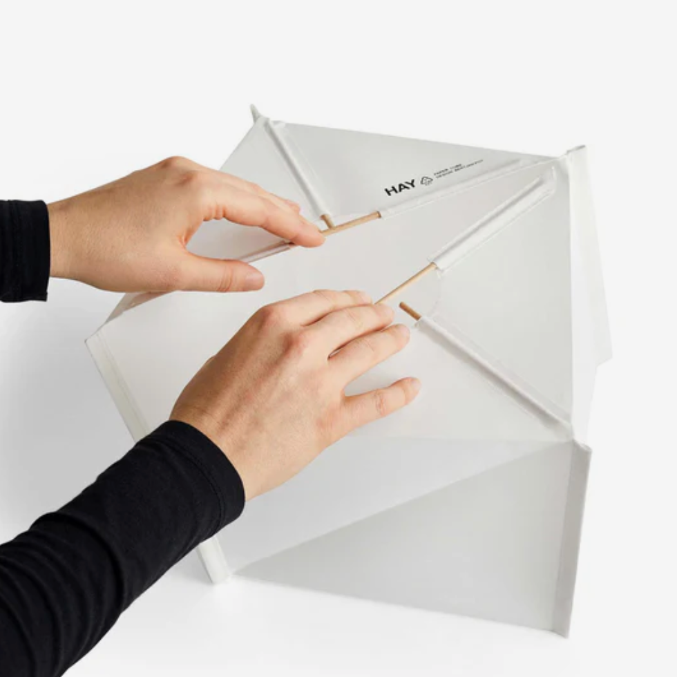 The HAY Paper Cube Table Lamp, designed by Bertjan Pot, features a folded cubed shape inspired by traditional paper ornaments. The lightweight shade is made from ECOPET™, a translucent material derived from recycled PET bottles, and comes as a flat-pack for easy assembly. The stand is made from beech wood.
