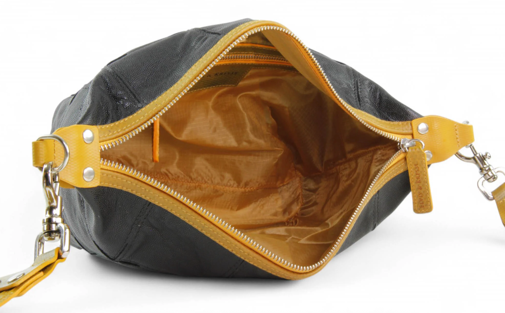 The Elvis & Kresse Boho Bag combines rescued leather and decommissioned fire-hose and is lined with reclaimed parachute silk.