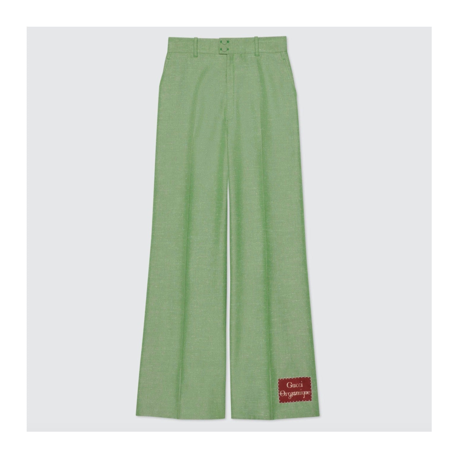 A new take on classic sartorial tags, the “Gucci Orgasmique” label features a distinctive motto of this collection, imbued with what Alessandro Michele described as a “beautiful cliché of sexiness.” A distinctive detail of the Spring Summer 2020 fashion show, the label enriches a pair of wide-leg trousers crafted from light green vintage effect viscose.